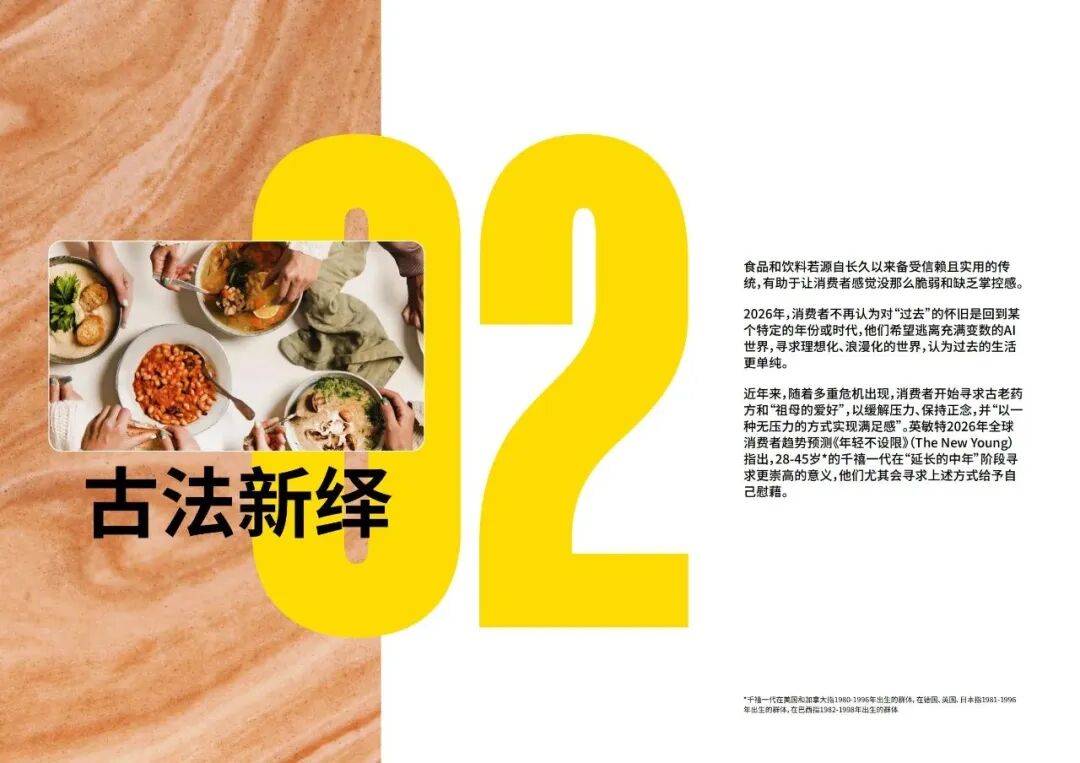 對2026年的消費者而言,對“過去”的懷舊并不意味著回到某個特定的年份或時代。相反,他們正尋求從一個充滿變數的人工智能世界中逃離,躲進一個認為過去生活更單純的理想化視野中。在近年的“多重危機”中,消費者已傾向于采用古老藥方來緩解壓力、保持正念,并以一種無壓力的方式實現滿足感。28-45歲的千禧一代在“延長的中年”階段尋求更崇高的意義,他們尤其會尋求上述方式給予自己慰藉。