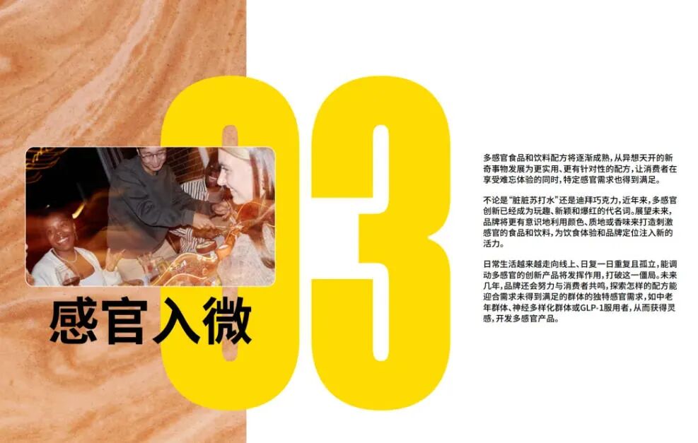 不論是“臟臟蘇打水”還是迪拜巧克力,近年來,多感官創新已經成為玩趣、新穎和爆紅的代名詞。展望未來,品牌將更有意識地利用顏色、質地或香味來打造刺激感官的食品和飲料,為飲食體驗和品牌定位注入新的活力。