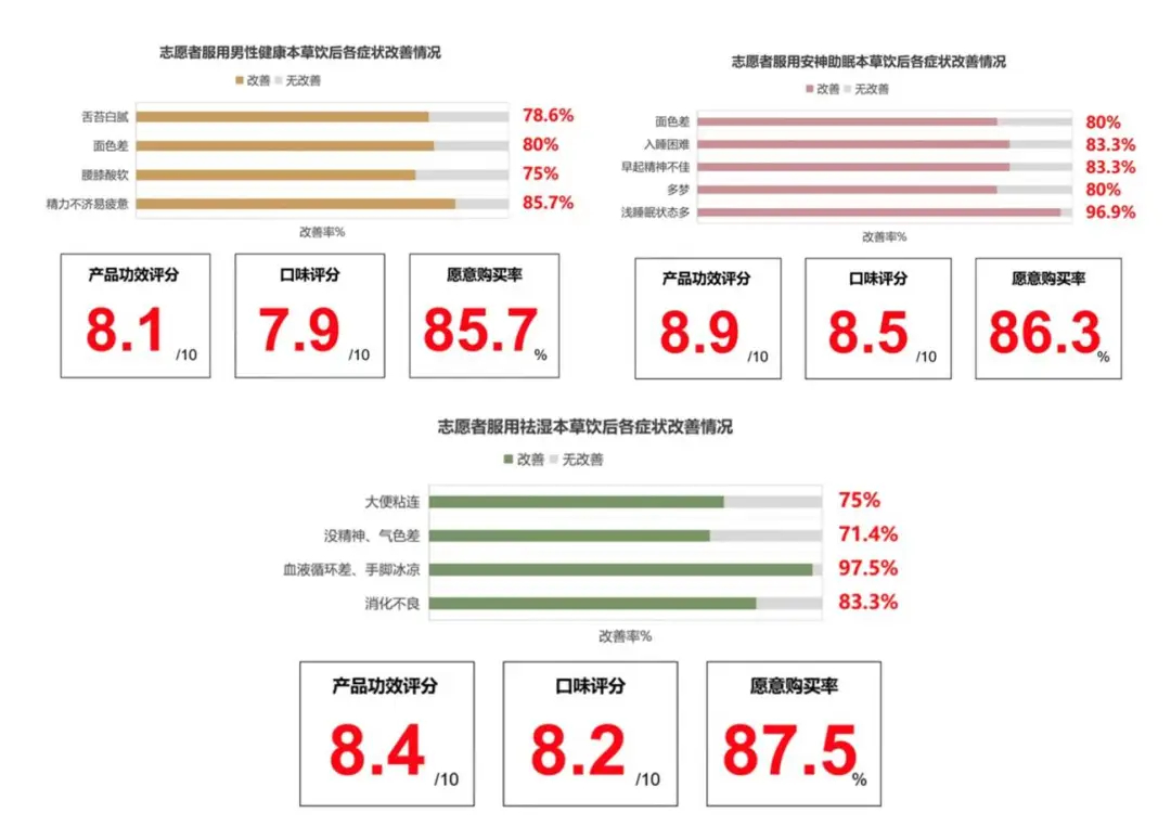 在男性健康領域,泰一健康針對易疲勞、精力不濟的男性志愿者開展為期兩周的試服研究。結果顯示,服用本草飲后志愿者在精力不濟易疲憊、腰膝酸軟等關鍵癥狀的改善率均超過75%,其中精力不濟改善率達85.7%,產品功效評分達8.1分(滿分10分),超過85.7%的志愿者表示愿意購買。