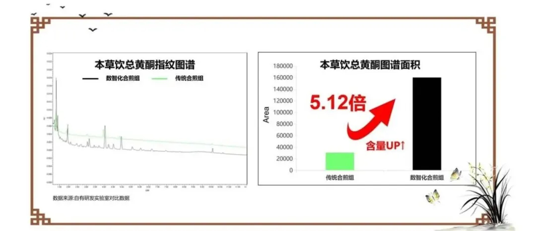 例如,在本草飲的“總黃酮”量變關系研究中,結果顯示數智化合煎工藝較傳統合煎不僅黃酮種類顯著增加,總黃酮含量更是提高了約5.12倍。