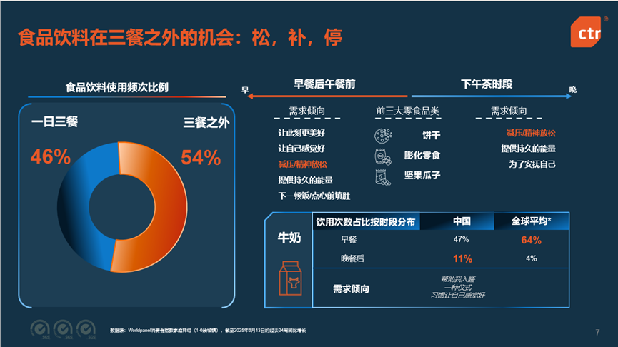 Worldpanel消費者指數居家飲食行為研究顯示,54%的食品飲料食用發生在三餐之外。零食類成為職場放松媒介,推動“辦公室輕零食”“通勤能量棒”等品類興起。與全球相比較,牛奶在中國有11%于睡前飲用,由此催生“助眠奶”等新品類。場景的真正機遇在于結合時間與心理需求,創造新消費入口。