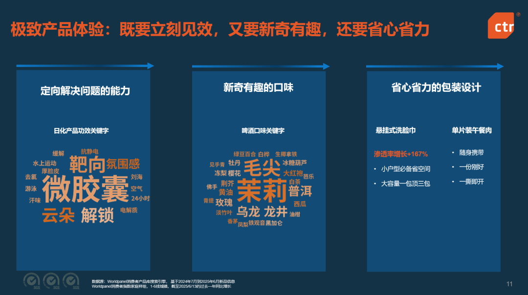 極致產品體驗是打動理性消費者的關鍵。品牌從“即時見效、新奇有趣、省心省力”三大維度構建競爭力。例如微膠囊技術實現精準護膚、啤酒融入龍井等中式風味打造差異化、懸掛紙巾和單片午餐肉更好適配小戶型及隨身場景。