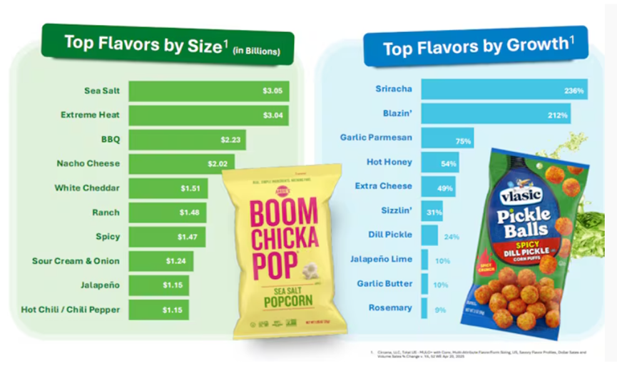 海鹽、燒烤和墨西哥奶酪味或許仍在銷量上占據主導地位,但它們的勢頭正被增長更快的新興口味所超越。是拉差醬味、熱蜂蜜味和大蒜帕瑪森味的增長速度遠超它們,而像泡菜調味料這樣由 TikTok 帶火的口味,正從薯片擴展到爆米花、種子等多個品類。根據 Circana 的數據,對新奇口味的需求在多個細分市場都實現了兩位數的增長。