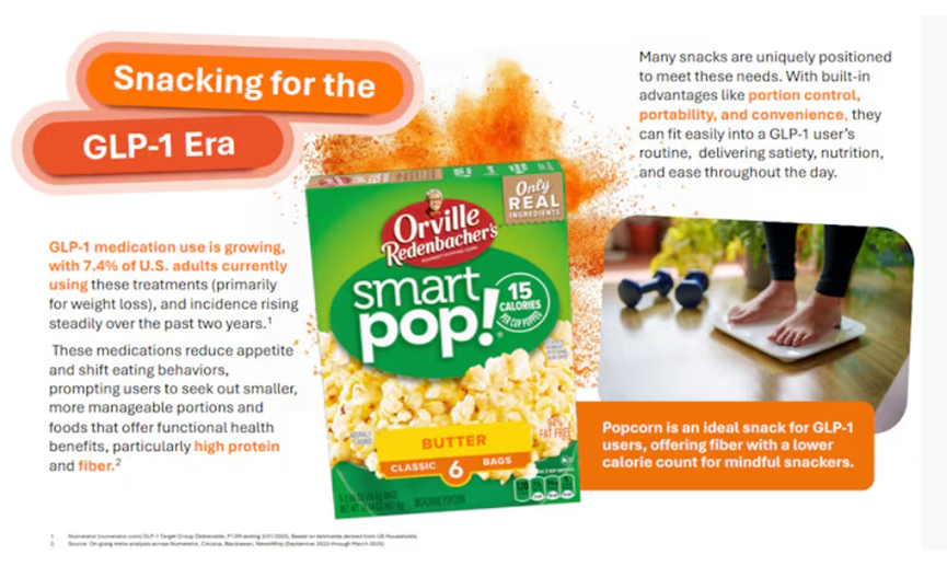 像 Ozempic 這樣的 GLP-1 類減肥藥的影響已經顯現。在美國,有 7.4% 的成年人在使用這些藥物,因此對既能滿足口腹之欲又能帶來飽腹感的零食需求正在上升。爆米花因其兼具低熱量和飽腹感的雙重定位,成為了受益者之一。