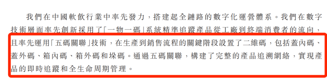 可見,“五碼體系”覆蓋了生產、物流、渠道、終端、消費者等流轉節點,把一瓶飲料的整個旅程都串聯在系統里,實現了“從生產到消費”的全鏈路可視化追蹤。這也讓每一瓶飲料都有了獨特的數據身份證: