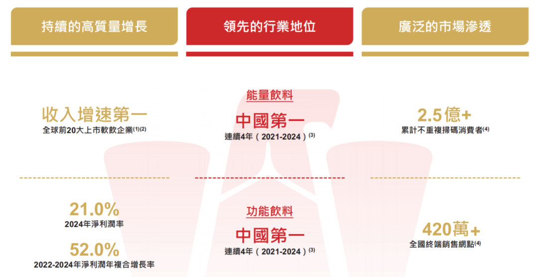 這種“數據效率”的紅利,也讓東鵬飲料在2022–2024年凈利潤年復合增長率達52%。另根據弗若斯特沙利文報告,按銷量計,東鵬飲料在中國功能飲料市場自2021年起連續4年排名第一。