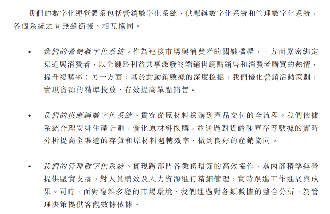 “我們始終堅持將數字化體系建設作為核心競爭力,將持續投入并完善現有的數字化系統,圍繞供應鏈、生產基地、渠道合作伙伴和終端消費者,搭建全鏈路透明化的數字化運營平臺?!?/p>