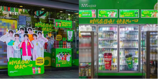 它們往往被擺放在飲料區最顯眼的區域里,五顏六色的杯子像彩虹一樣排列在多行貨架,每個杯蓋上都貼著貼紙,周圍的墻上還掛著印有時代少年團的代言人海報。