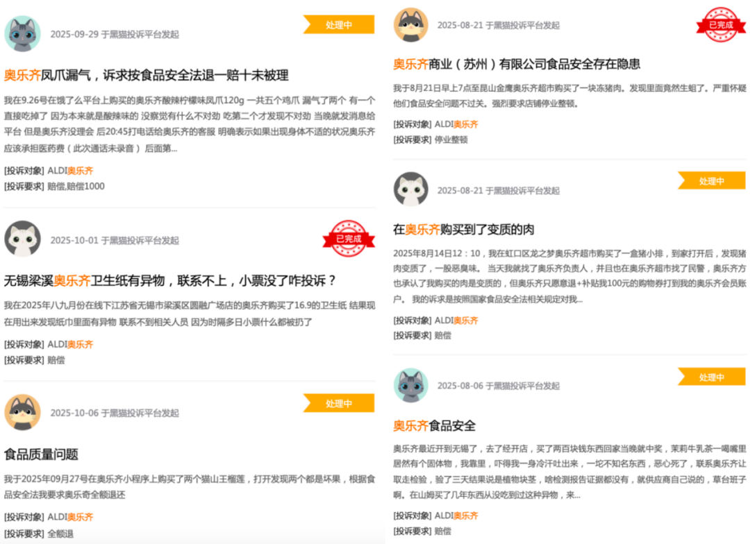 據公開投訴信息顯示,2025年7月以來,有消費者反映購買的食品中出現異物、水果腐爛等問題,部分消費者稱維權時曾遭遇門店工作人員對《食品安全法》相關條款的質疑;據黑貓投訴平臺公開信息顯示,截至2025年10月10日,奧樂齊相關投訴已達221條,其中超40%發生在2025年,蘇州、無錫的新店也卷入爭議。