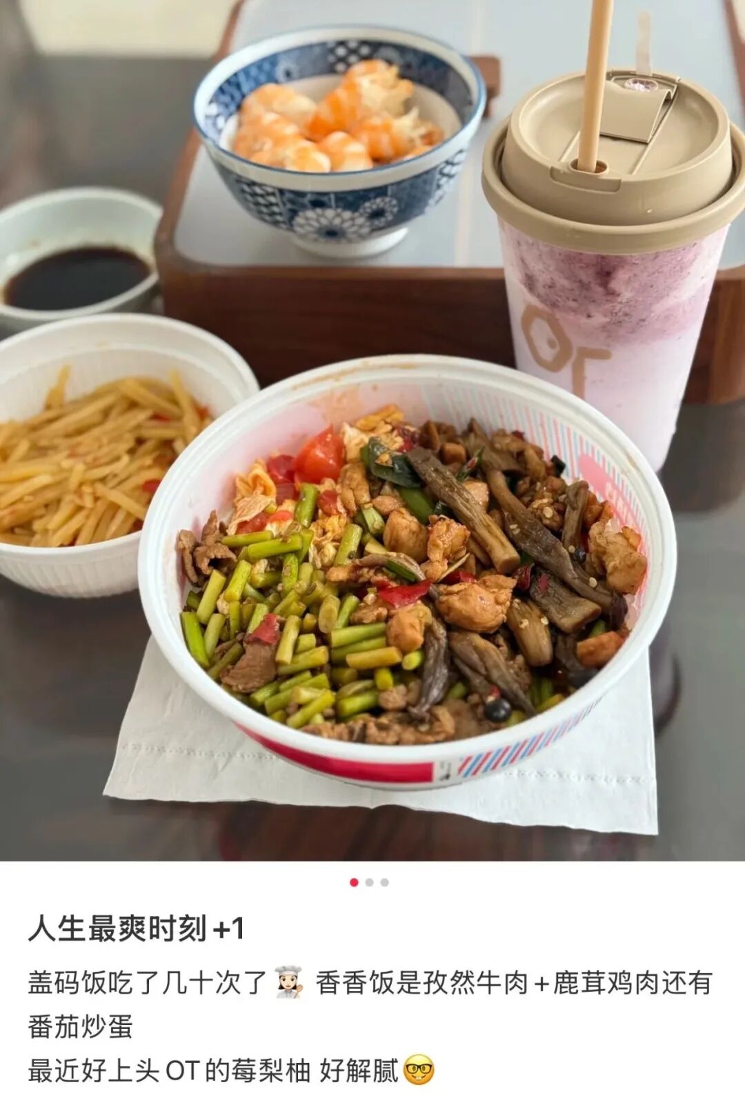 蓋碼飯就像是打工人的“貓飯”,一碗出,要啥有啥,營養充足。在“一頓外賣只要顯露出一點對你健康的關心,就有了溢價的理由”的今天,蓋碼飯反倒成了一種樸素和務實。