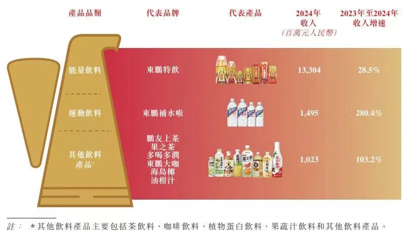 目前,能量飲料仍是東鵬飲料的主要收入來源,但占比已從2023年的91.9%下降至2024年的84.0%。與此同時,東鵬飲料的運動飲料業務迅速崛起,2023年-2024年收入增速高達280.4%,占2024年總收入的9.4%。其他飲料產品同樣表現不俗,2023年-2024年收入增速達103.2%。
