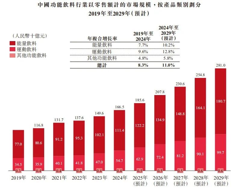 目前,中國軟飲行業仍是一個規模達萬億的巨大市場。根據弗若斯特沙利文報告,2024年中國軟飲行業零售額約達1.3萬億元,是全球第二大軟飲消費市場。在這個龐大市場中,功能飲料已成為增長最快的板塊。2019年-2024年,功能飲料市場規模的年復合增長率達8.3%,高于同期整體軟飲市場的4.7%。