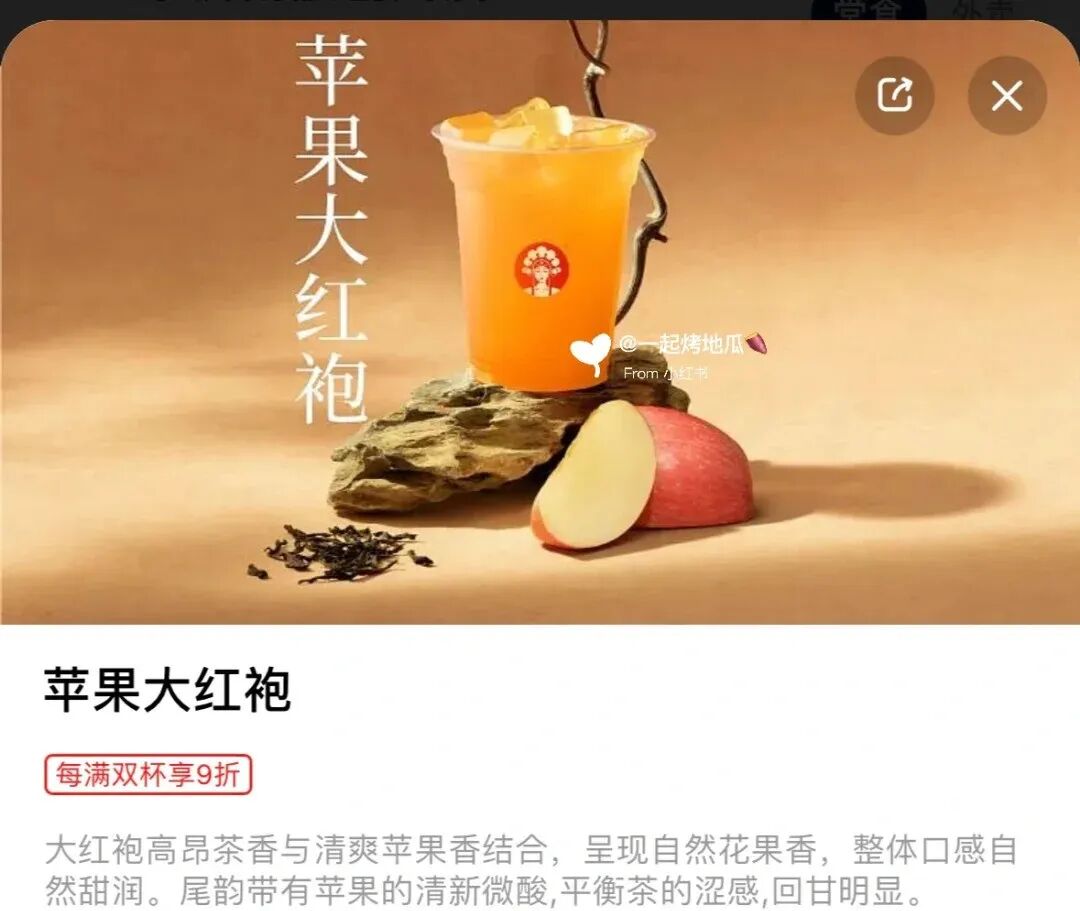 比如霸王茶姬的蘋果大紅袍,宣傳語描述的是“大紅袍高昂茶香與清爽蘋果香相結合”;