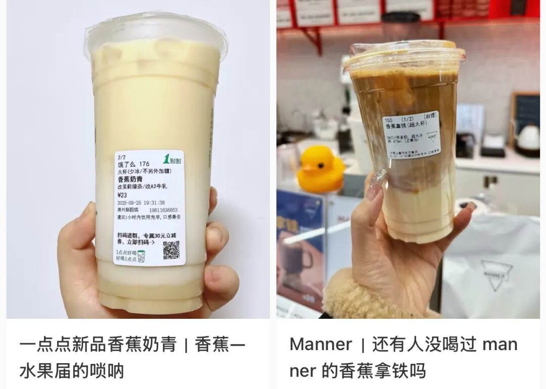 但香蕉口味就這么邪修式地火了,所謂平凡到極致就是特色,manner香蕉拿鐵、一點點香蕉奶青獲得了不少追隨者。