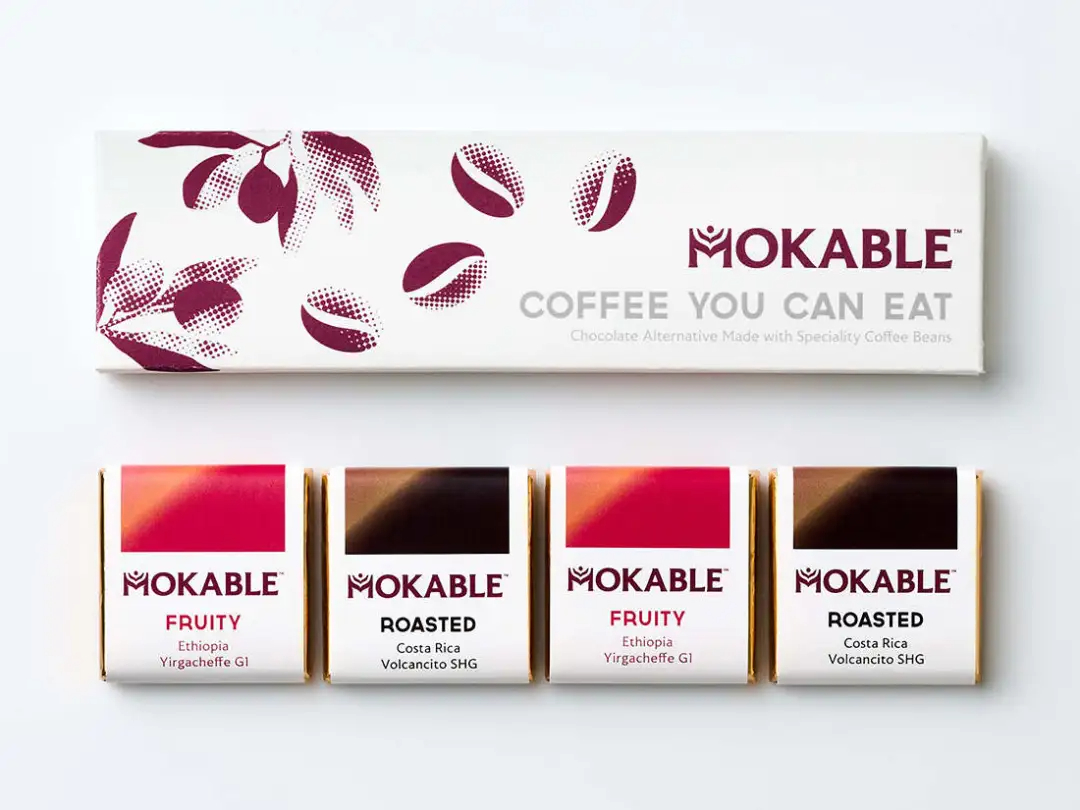 為此,MOKABLE創造了一種一口大小的咖啡“巧克力”——將咖啡豆粉碎,和可可脂、棕櫚油、乳木果油等可持續的植物油脂混合,并壓制成巧克力排塊狀,形成一種“可食用”的咖啡。
