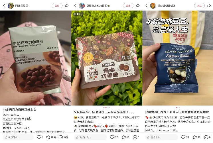 如日本的KALDI、無印良品,歐洲地區的Harrods、LOLLO CAFFE,美國的Trader Joe's,以及國內的叮咚買菜等品牌均推出了巧克力包裹整顆烘焙咖啡豆類的咖啡豆零食,可作為日常零食或禮贈產品。