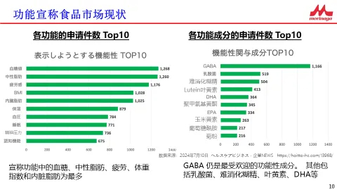 憑借持續的科研投入和完善的功能聲稱制度,已成為日本銀發營養與功能性乳飲市場的重要推動者。從功能性標識市場貢獻度及申報數量來看,森永位居日本TOP10。