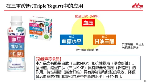 森永采用的原料主要為水解蛋白及多肽。早在20世紀60年代森永便開始探索該技術。當時,研發水解蛋白的初衷是為了改善嬰兒過敏問題。近年來,隨著研究的深入,森永發現MKP多肽具有顯著抑制血管緊張素轉化酶(ACE)的作用,由此推測其對血壓管理具有潛在效果。在此基礎上,森永乳業將MKP多肽與另一種功能性原料進行科學配比,開發出針對“三高”(高血壓、高血糖、高血脂)人群的功能性產品,并獲得日本功能性聲稱標識。