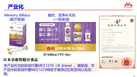 年齡的增長會使人體很多生理功能下降,其中一個顯著問題是記憶力下降,尤其是阿爾茨海默?。òl現后無法治愈,重點在于預防)。為了解決這一痛點,森永重點研究了雙歧桿菌MCC1274。相關臨床數據顯示,該菌株能夠顯著改善記憶功能,并已轉化為酸奶、固體飲料和營養補充劑等多種產品。