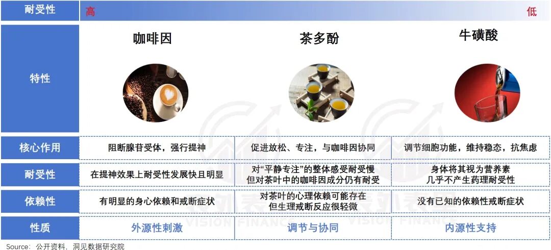 畢竟能量飲料配方主打“?;撬?咖啡因”,其中?;撬崾翘烊淮嬖谟谌梭w內的氨基酸,攝入后更不容易產生耐受性。且目前能量飲料遠不如茶咖流行,對大多數人來說,提神效果依舊“立竿見影”。