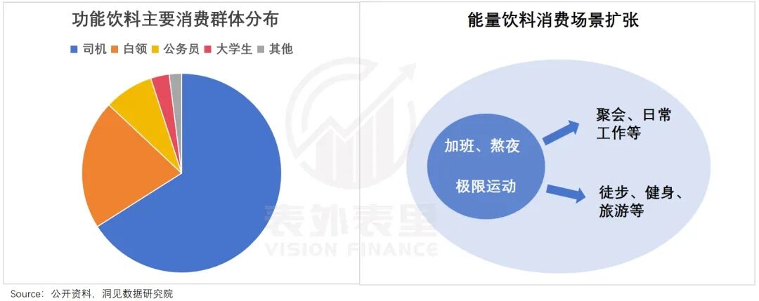 數據顯示,功能飲料核心用戶中,白領、公務員、大學生占據了不小的比例。能量飲料逐漸從卡車司機、快遞小哥“專屬補給”,升級為“全民日??蛊诮鉀Q方案”。